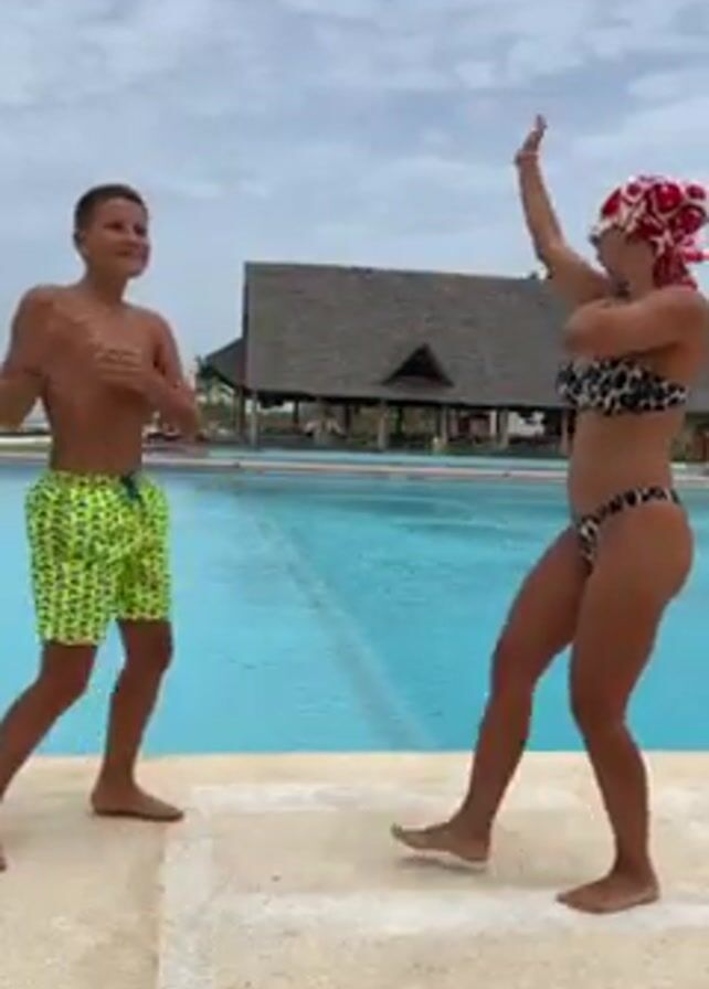 A boy and a woman are dancing on the edge of a swimming pool. The boy is wearing green swim trunks with yellow designs. The woman is wearing a leopard print bikini and a red head scarf with sunglasses. The pool is large and blue, with a building with a thatched roof in the background. The sky is cloudy. The pair performs synchronized dance moves, smiling as they raise their arms.