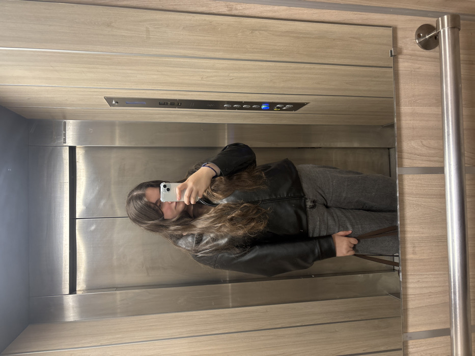 The image depicts a person taking a mirror selfie inside an elevator. The individual, appearing female, has long, wavy dark brown hair and is dressed in a black, collared, zippered jacket, a dark garment underneath, and grey trousers. A thin blue bracelet is visible on her left wrist. She holds a light-colored smartphone with a clear case in her right hand, angled to capture the reflection. Her left hand holds the strap of a dark brown or black bag near her hip. The elevator interior features light wood-grain laminate panels on the side walls. The rear wall consists of brushed metal panels, likely the elevator doors. A vertical control panel is integrated into the right wood-grain wall, containing multiple dark buttons and a vertical digital display, with one button illuminated blue. A large mirror covers the front wall, reflecting the individual and the elevator's interior. A horizontal metal handrail is mounted across the lower portion of the mirror. No specific features within the image allow for the precise identification of a location within Strasbourg, France.