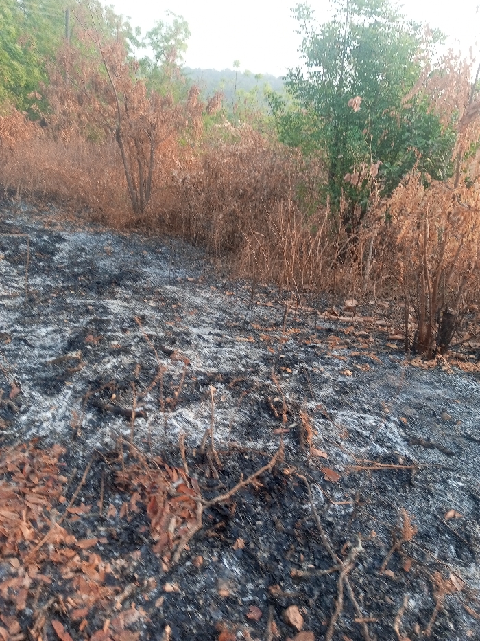 The scene depicts an outdoor environment in Okeni, Nigeria, exhibiting the aftermath of a ground fire. The immediate foreground is extensively covered by a layer of black ash and charred organic matter, interspersed with patches of white ash and scattered reddish-brown, partially burnt leaves and small plant debris. In the midground, a dense line of dried, brown, and partially burnt vegetation, consisting of shrubs and grasses, extends across the frame. Amidst this dry vegetation, particularly towards the right, clusters of green foliage from unaffected or recovering plants are visible. The background features a dense expanse of green trees and foliage, with faint, hazy hills visible on the horizon beneath a pale sky. Indistinct vertical structures, possibly utility poles with overhead lines, are faintly discernible in the upper left quadrant. No human or animal subjects are present in the image.