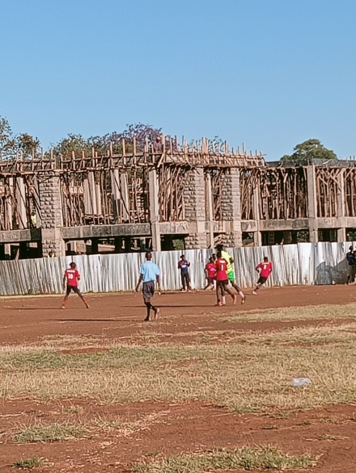 The scene is located in Lugari ward, Kenya. The image depicts an outdoor, unpaved sports field with reddish-brown dirt and sparse patches of dry grass. In the foreground and midground, approximately six men are engaged in activity consistent with a soccer game. One man in a red jersey with the number 10 is positioned on the left, facing right with legs spread. Another man in a light blue shirt and dark trousers walks towards the right in the center-left. In the mid-right, two men run towards the right: one in a red jersey (number 7 partially visible) and another in a bright yellow/lime green shirt. Further right, an additional man in a red jersey is in motion. A clear plastic bottle lies on the ground in the mid-right. The background features a corrugated metal fence separating the field from a multi-story building under construction. The building structure is composed of concrete block walls with extensive wooden scaffolding and formwork supporting exposed rebar. Several individuals are visible standing near or behind the fence, some observing the field. Behind the construction, various trees are visible, including one with purple blossoms. The sky above is clear and blue, indicating daylight.