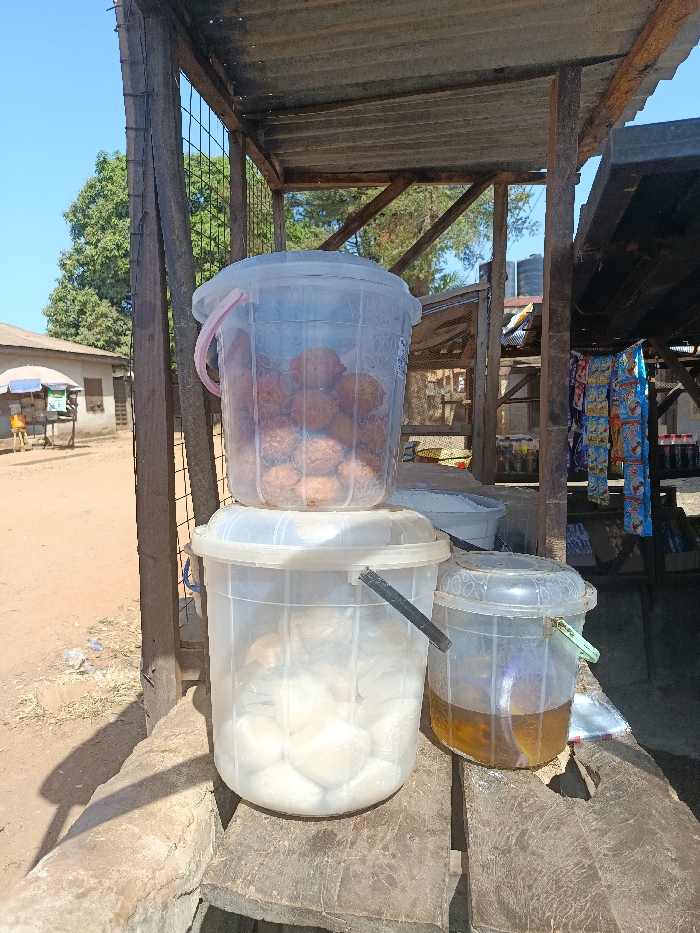 The scene depicts an outdoor food stall in Akwanga, Nigeria. In the foreground, three clear plastic buckets containing food items are arranged on a weathered wooden surface. The topmost bucket, with a pink handle, holds numerous round, brown, fried items. Below it, a larger bucket with a black handle contains several white, rounded food portions, possibly individually wrapped. To the right, a smaller bucket with a light green handle holds a yellowish-brown liquid, likely a sauce or palm oil. These buckets rest on a rough wooden plank, part of a rudimentary stall structure made of unpainted wooden posts and beams, topped with a corrugated metal roof. Wire mesh is visible on the left side of the stall's frame. The background to the left features an unpaved, reddish-brown dirt road. A distant, light-colored building with a dark roof is visible, along with another market stall covered by a light-colored umbrella. A person in an orange shirt is partially visible near this distant stall. Lush green trees stand against a clear blue sky. To the right of the primary stall, additional packaged snacks are hanging from strings, indicating a wider market or retail area. Further in the background on the right, structural elements of other buildings and a black overhead water tank are discernible. The overall environment suggests a bustling, open-air commercial setting.