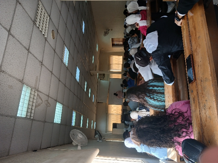 The image depicts an indoor classroom or lecture hall in an unidentified city, Unknown. Approximately 30-40 individuals, appearing to be young adults, are seated at wooden desks and benches, facing the front of the room. A person, potentially an instructor, stands near a whiteboard at the front, addressing the students. Many female students wear head coverings. In the foreground, a student with dark, curly hair wears a pink top, and another student in a black jacket and backward black baseball cap is visible. A red-brown smartphone lies on a wooden desk in the immediate foreground. The room features light-colored walls, a large window with vertical blinds on the left, and a white grid-panel drop ceiling with numerous recessed fluorescent light fixtures. Several ceiling panels exhibit water stains. Two white wall-mounted fans are visible, one on the left and another in the distant right. The room is illuminated by a combination of natural light from the window and artificial light from the overhead fixtures. The wooden desks show signs of wear.
