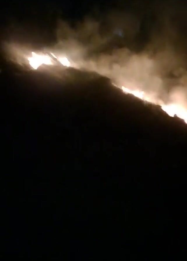 fire burning on a hillside at night. The flames are visible along the top edge of the hill, silhouetted against the dark sky. Smoke is rising from the fire. The rest of the scene is in darkness. An audio clip captures distant human speech.