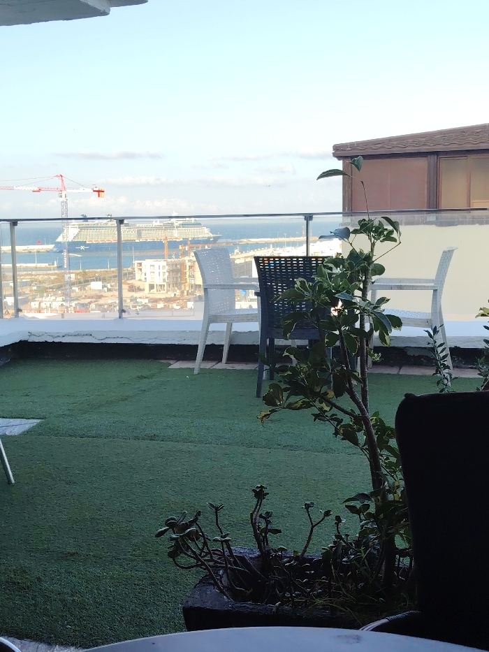The image displays an elevated outdoor terrace or rooftop garden overlooking the Port of Tangier, Morocco