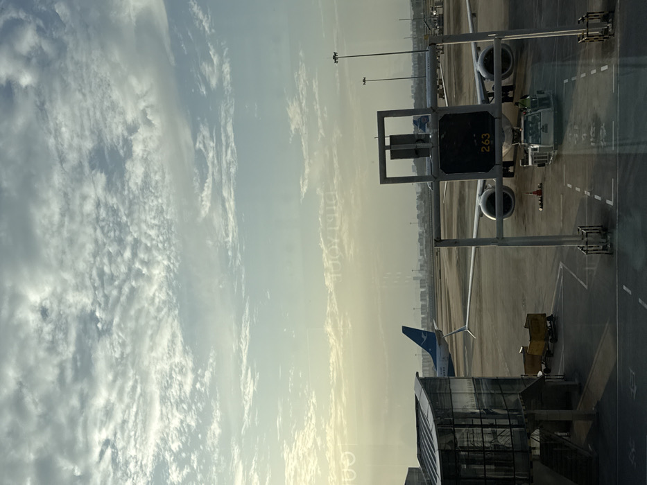 The image presents an airport tarmac scene observed from within a terminal building, identifiable as Guangzhou Baiyun International Airport (CAN) in Guangzhou City, China. This identification is supported by the visible livery of a China Southern Airlines aircraft (blue tail with white bird logo) and the distant urban skyline. The sky is predominantly overcast with numerous scattered altocumulus clouds, displaying a pale blue-grey hue, with a bright, diffuse yellowish-white light near the horizon on the left. Faint, inverted reflections of text, including "TOUR" and "DIP YOGI", are visible on the interior surface of the viewing window. In the mid-ground, two airplanes are parked on the asphalt tarmac. To the left, the blue tail section and rear fuselage of a narrow-body aircraft, belonging to China Southern Airlines, are visible. Adjacent to this aircraft, a modern, glass-sided jet bridge structure is positioned, featuring stairs leading down to the tarmac. Two yellow baggage carts are parked near the base of these stairs. Further to the right, a larger, wide-body aircraft is connected to a metal-framed jet bridge. This jet bridge displays the number "263" on a digital screen. The aircraft's two visible engines are positioned under its wings. A white pushback tug is stationed in front of the aircraft's nose gear, and one individual, dressed in a high-visibility vest, stands near the tug. A single orange traffic cone is located on the tarmac directly in front of the tug. The background shows a distant, hazy urban skyline comprising numerous high-rise buildings. Several tall airport lighting poles are also visible across the tarmac in the middle and far distance. The tarmac itself features various painted white markings.