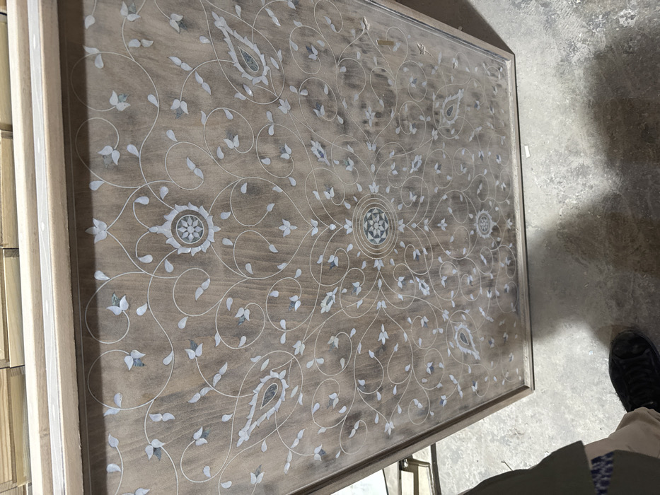 A wooden framed panel with a geometric pattern of inlaid mother-of-pearl. The pattern is made up of flowers, leaves, and swirls. The panel is lying on a concrete floor. The coordinates (latitude: 33.447, longitude: 36.278) place this image in the city of Sbeneh, Syria. A portion of a person's foot can be seen in the lower left of the image. There is an area of shadow cast by the panel on the concrete floor. The panel is surrounded by rough wooden beams. The setting appears to be an interior workshop or construction site.