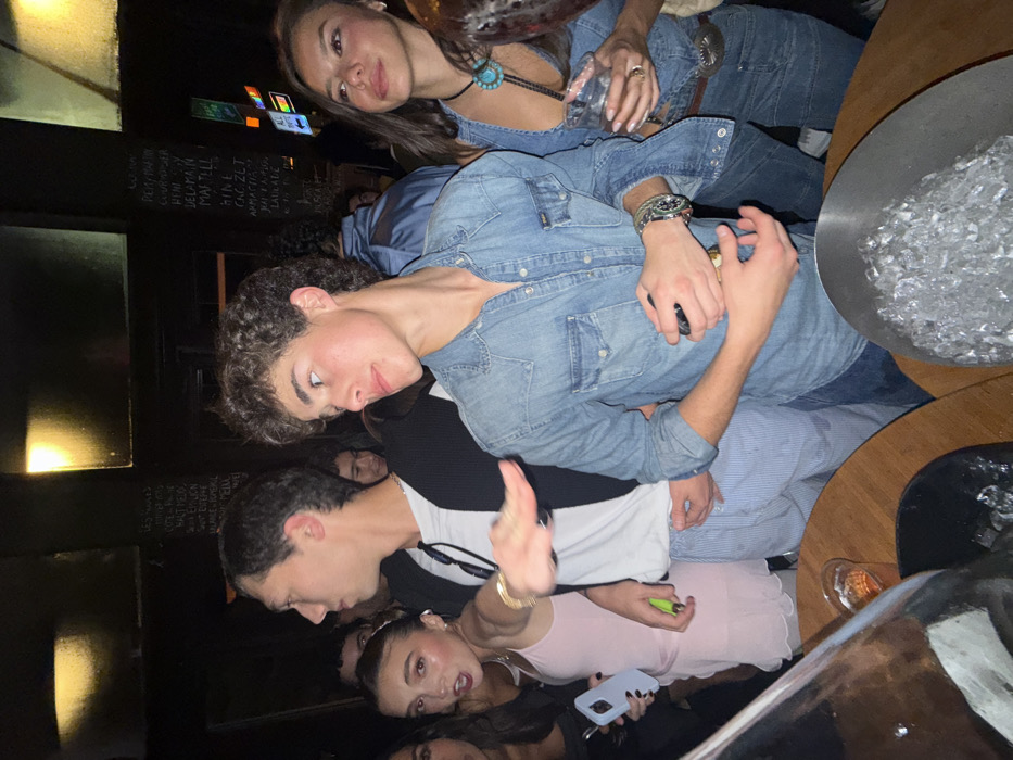 The image depicts a crowded, dimly lit bar or nightclub setting, consistent with venues found in New York City. Four young adults are prominently featured in the mid-to-foreground, with other individuals visible in the blurred background. From left to right: A young woman with dark hair wears a light pink slip dress. Her mouth is open, and her right hand, holding a neon green object (possibly a lighter), is blurred and extended forward. Her left hand holds a white smartphone. Next to her, a young man with short dark hair wears a white t-shirt layered under a dark, long-sleeved top and light blue pinstriped pants. Sunglasses are tucked into his shirt collar. He is looking to his left, away from the camera. Centrally positioned, a young man with curly brown hair wears a light blue denim button-up shirt with two breast pockets (a "Wrangler" tag is visible on the left pocket). He wears a watch on his left wrist and holds a small, dark object in his right hand. He is looking to his left, past the man next to him. To his right, a young woman with long dark hair wears a denim top/vest, dark denim pants, and a prominent silver concho belt. A turquoise bolo tie or necklace is visible around her neck. She holds a clear plastic cup containing liquid in her right hand and is looking to her left. The foreground includes two round, wooden tables. On the table to the left, a clear glass bottle and a small glass with an amber-colored drink are visible. On the table to the right, a large, silver oval bucket filled with ice is present. The background features dark walls with light reflections and indistinct white writing, possibly chalked menus or décor, including words like "Hennesy" and "Martell." The overall atmosphere is social and active.