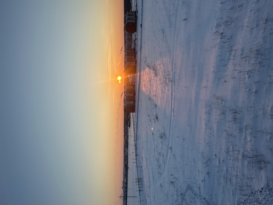 An aerial view captures a winter landscape at sunset or sunrise in Hlybokaye, Belarus. The sky features a gradient, transitioning from a light blue overhead to an orange and pink hue near the horizon. The sun, a bright orange orb, is low on the horizon, centered horizontally, partially obscured by distant buildings. A distinct, elongated triangular ray of sunlight extends from the sun across the snow-covered field towards the foreground. In the mid-ground, a cluster of multi-story residential apartment buildings with reddish-brown facades is visible. White plumes of smoke or steam emanate from chimneys on several of these structures. Further to the left in the mid-ground, power poles and lines traverse the flat, snow-covered terrain. A faint outline of a more distant urban or industrial area can be seen on the far-left horizon. The foreground and much of the mid-ground consist of a vast, flat field covered in undisturbed white snow. Sparse patches of dried vegetation and stalks protrude through the snow. Visible in the lower-left foreground are multiple sets of footprints and tracks in the snow, suggesting pedestrian or small vehicle movement. No people or animals are present in the frame. The overall impression is a cold, clear winter scene during twilight hours.