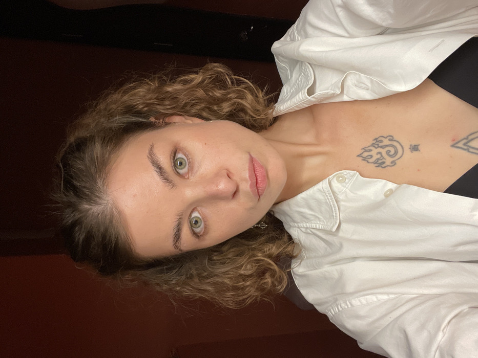 A woman with curly brown hair and green eyes looks directly at the camera. She wears a partially unbuttoned white shirt over a black top. The background is dark. Tattoos are visible on her chest, one resembling clouds with flames, another a Chinese character and a third geometric design. The image is slightly rotated counterclockwise.