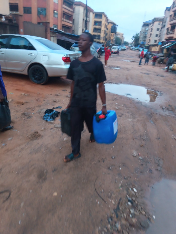 This image depicts a street scene in Onitsha, Nigeria. The specific location is an unpaved, dirt road characterized by numerous potholes, some containing standing water and mud, indicating recent rainfall or poor drainage. The road is lined on both sides by multi-story buildings, appearing to be a mix of residential and commercial structures, several of which show signs of age or wear. In the immediate foreground, a young male, appearing to be in his late teens or early twenties, walks towards the viewer's right. He is wearing a black t-shirt with a faint graphic design, dark trousers, and dark sandals. He carries a black rectangular container in his left hand and a blue plastic jerrycan with an orange handle and white label in his right hand. His gaze is directed slightly to his right. Partially visible on the far left is another individual, wearing blue clothing and carrying a dark bag. A silver sedan, possibly a Toyota Camry, is parked on the left side of the dirt road, positioned behind the main subject. Its wheels are dark-colored. Further down the street, various other individuals are visible, including a person in a red dress walking away from the camera, and groups gathered near what appear to be market stalls or shops on the right side of the road. Other vehicles are present in the distant background. The sky appears overcast, suggesting either dawn, dusk, or a cloudy day. Debris and scattered refuse are visible on the road surface.
