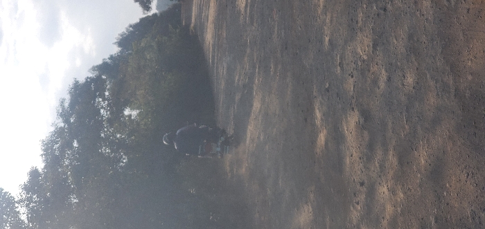 A person is riding a bicycle along a dirt path. Trees and sky appear to the left. The path is a rough, brown surface and curves away from the viewer on the right side of the frame. The scene is overcast or hazy, giving it a slightly muted tone. The person on the bicycle is positioned near the center, heading away from the viewer.