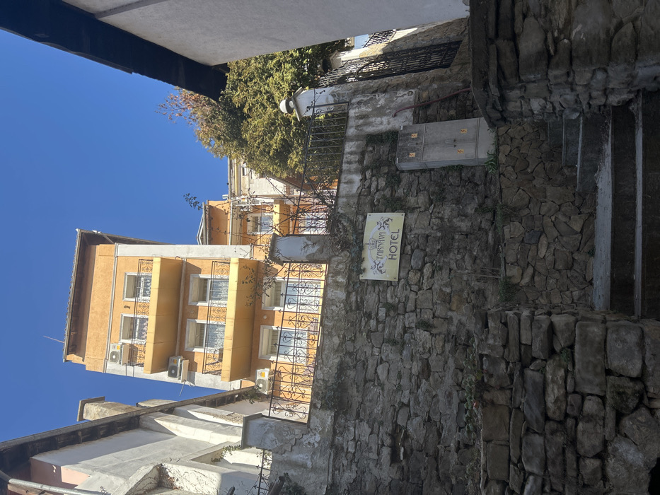 An upward-angled view captures a section of a steep, stepped pathway in an urban environment. In the immediate foreground, a series of uneven stone steps ascend towards the middle of the frame, flanked on the left by a low, rough-hewn stone wall. This wall transitions into a taller, more substantial stone retaining wall that traverses the midground. Affixed to this larger stone wall, slightly left of center, is a rectangular yellow sign with a white border, featuring a crown above two rampant lion-like figures, and the text "TARNAVA HOTEL." Below and to the right of the sign, a grey electrical utility box is mounted on the wall. Above the stone retaining wall, a decorative black metal fence with ornate scrollwork, supported by white concrete posts with rounded caps, runs along the perimeter of a property. Sparse, thin, dark vegetation with some leaves clings to and grows over parts of the stone wall and fence. Dominating the background is a multi-story building, likely the "Tarnava Hotel," distinguished by its orange-yellow facade. This building features three visible levels of balconies, each equipped with black metal railings matching the fence below and hosting multiple windows. One white external air conditioning unit is visible on the wall below each of the two upper balcony levels, and one below the lowest visible balcony. To the far left, a portion of another building with light-colored walls ascends steeply. To the right of the orange-yellow hotel building, parts of additional structures and a large, full green tree are visible. The sky above is a clear, bright blue, indicating sunny weather. No individuals are present in the scene.