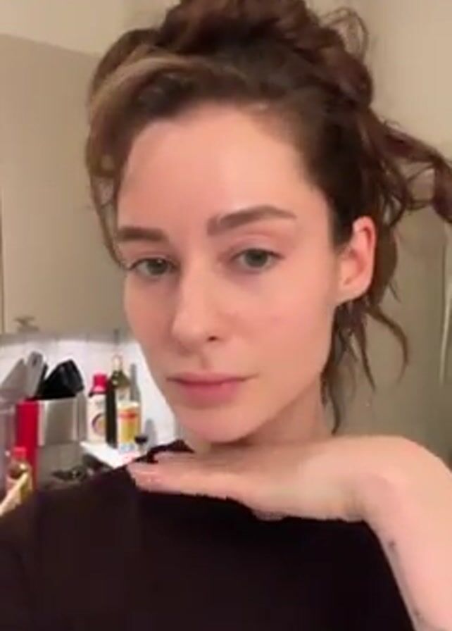A fair-skinned woman with brown hair tied in a messy bun is in a kitchen. She is wearing a dark brown turtleneck shirt. She has a small tattoo on her left forearm. She holds her hand under her chin and poses, turning her head slightly and puckering her lips at one point. Behind her is a white countertop with various bottles and items on it. There are light-colored cabinets on the wall behind the counter. The lighting is soft and diffused.