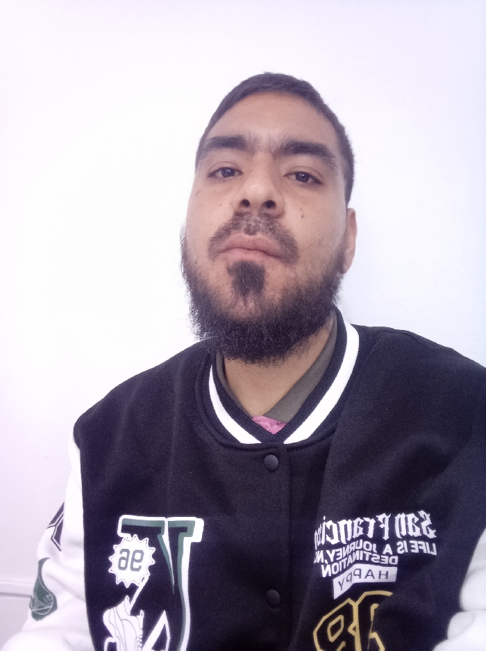 A man with dark hair and a beard poses for a portrait. He wears a black varsity jacket with white stripes on the collar and cuffs. The jacket features patches, including a large "V" with the letters "ae" inside, and text that reads "SAN FRANCISCO LIFE IS A JOURNEY, NOT A DESTINATION HAPPY." The background is a plain white wall.