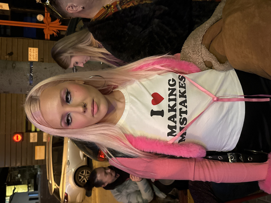 The image depicts a nighttime street scene in an urban area of Tel-Aviv, Israel. The central figure is a young adult female with long, straight, platinum blonde hair showing pink streaks, styled with a center part. She has prominent pink eyeshadow, dark eyeliner, and blush, along with a nose ring on her right nostril and large silver hoop earrings. Her expression is neutral, and she gazes slightly to her left. She wears a white t-shirt featuring a red heart and the black text "I LOVE MAKING MISTAKES," cinched by a pink ribbon tied at the sternum. Over the t-shirt, she wears a pink ribbed long-sleeve top with bright pink faux fur trim along the neckline and cuffs. A black shoulder bag with silver buckle hardware is visible on her left side. In the mid-ground to the left, a woman with dark hair pulled back, wearing a light-colored puffer jacket and a dark scarf, is partially visible, looking downwards. Behind her, a silver Renault Megane station wagon is parked. To the right of the central figure, a woman with blonde hair, wearing a purple top, is visible, looking downwards. On the far right, a man's right shoulder and head are visible, showing short dark hair, a beard, a crown-like headpiece, and an earring. He wears a patterned shirt under a dark, fur-textured jacket. The background includes a dark pole with a brown sign displaying Hebrew text "אין חניה כניסה ויציאה" (No Parking, Entrance and Exit), confirming the location in Israel. Above the sign, a circular red light is affixed to a building structure or another pole. An orange decorative bow is visible on a wall further to the right. The scene is illuminated by artificial light sources.
