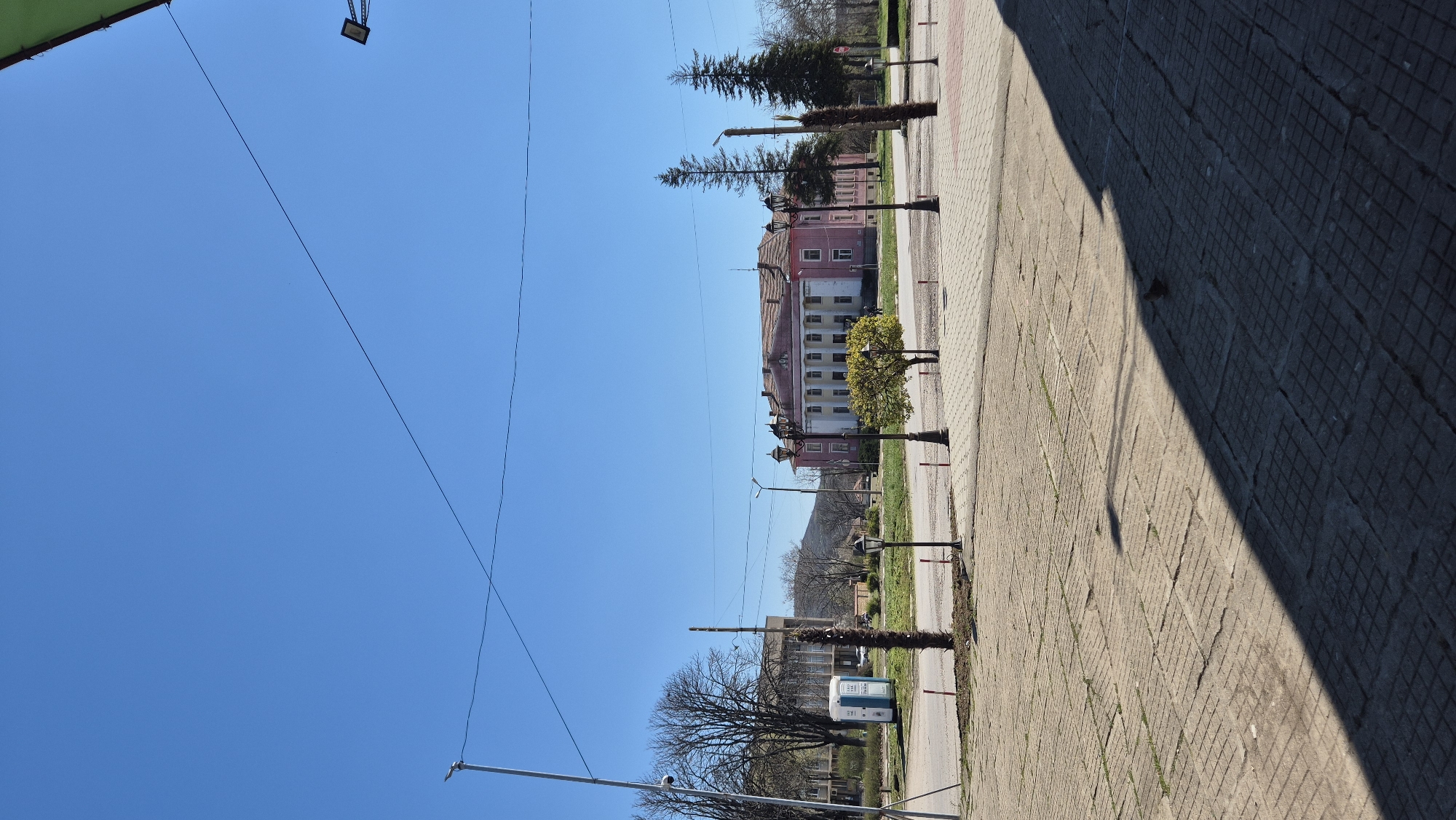The image depicts a street scene in Mihaltsi, Bulgaria. A paved walkway runs along the right edge of the frame, casting a long shadow. Along the walkway are evenly spaced lamp posts. Adjacent to the walkway is a grassy area with trees, including some bare branched trees and taller coniferous trees. Beyond the trees is a pink-hued building with a red tiled roof. A portable toilet can be seen near one of the bare branched trees. Overhead are power lines stretching across the clear blue sky.