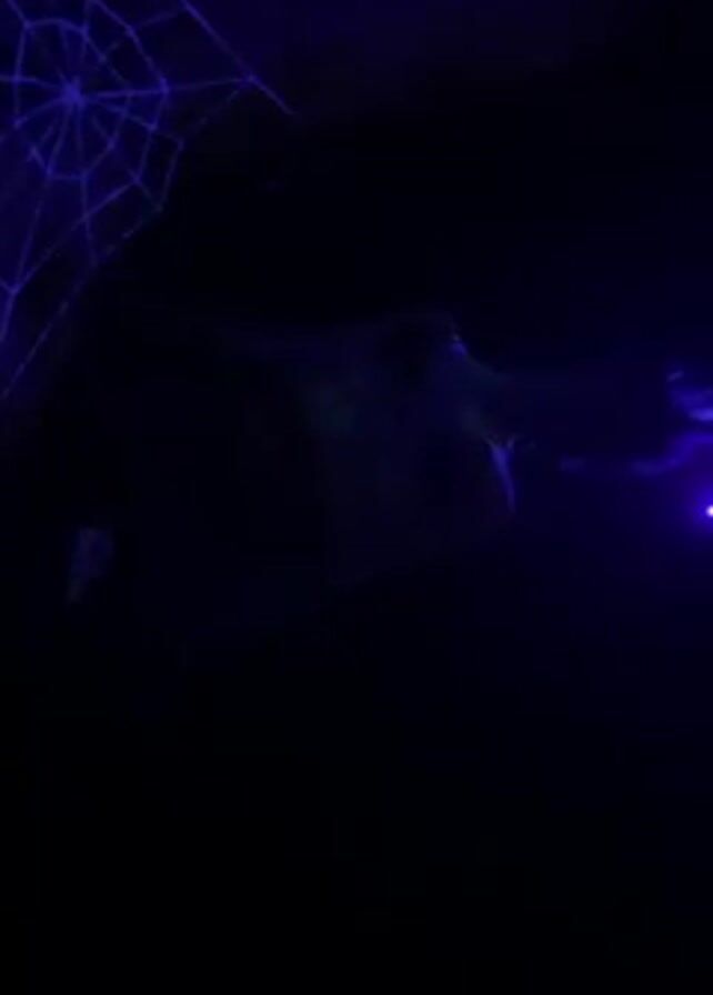 The video depicts a dark room with a spiderweb decoration illuminated by a purple light. It's difficult to discern further details because of the low lighting. There appears to be a person in the room but it is not distinct. Music is audible.