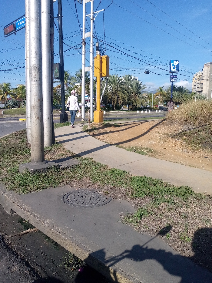 The image depicts an outdoor street scene under a clear blue sky, specifically at the intersection of Av. 4 de Mayo and Av. Jóvito Villalba in Pampatar, Margarita Island, Venezuela. In the foreground, a concrete sidewalk is visible, featuring a circular metal manhole cover. The sidewalk is bordered by sparse green and dry vegetation. Multiple utility poles, including three prominent silver-colored poles and a yellow pole with an attached yellow utility box, stand vertically. A blue street sign, affixed to one of the silver poles, displays the text "Av. 4 de Mayo" and "Av. Jóvito Villalba." A single female pedestrian is observed walking away from the viewer on the sidewalk, wearing a white long-sleeved shirt, blue jeans, and a light-colored cap. She carries a white object, likely a bag, in her left hand. To the immediate right of the sidewalk, a dirt slope covered with dry grass and sparse vegetation is present, casting long shadows. Beyond the sidewalk and slope, a multi-lane asphalt road is visible, featuring a median delineated by white spherical bollards and lined with numerous palm trees and tropical foliage. A prominent blue vertical sign with the Farmatodo logo and "Pampatar" text is situated on the right side of the road, in front of a multi-story building with a distinctive angular facade. Distant hills or mountains are discernible under the clear sky. The scene is illuminated by strong sunlight, casting distinct shadows to the right.