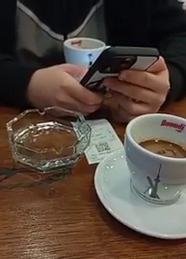 Here's a detailed description of the video: The video shows a person sitting at a wooden table, focused on their smartphone. Two cups of coffee, both partially consumed, are on the table, along with a small cream pitcher, a sealed container with green writing, an ashtray, and a receipt. The cup closest to the camera is white with a black design featuring a tower and has the word "Buondi" printed in red above the design. A small wooden coffee stirrer is inside. The person is wearing a black and white jacket. The camera slowly circles around the table, maintaining focus on the coffee cup and the person's hands holding the phone. Background chatter is audible, suggesting the location is a cafe or restaurant.