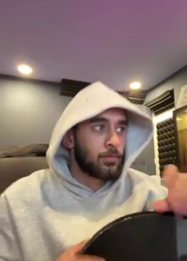 A bearded man in a grey hooded sweatshirt sits in a recording studio, tapping a black drum