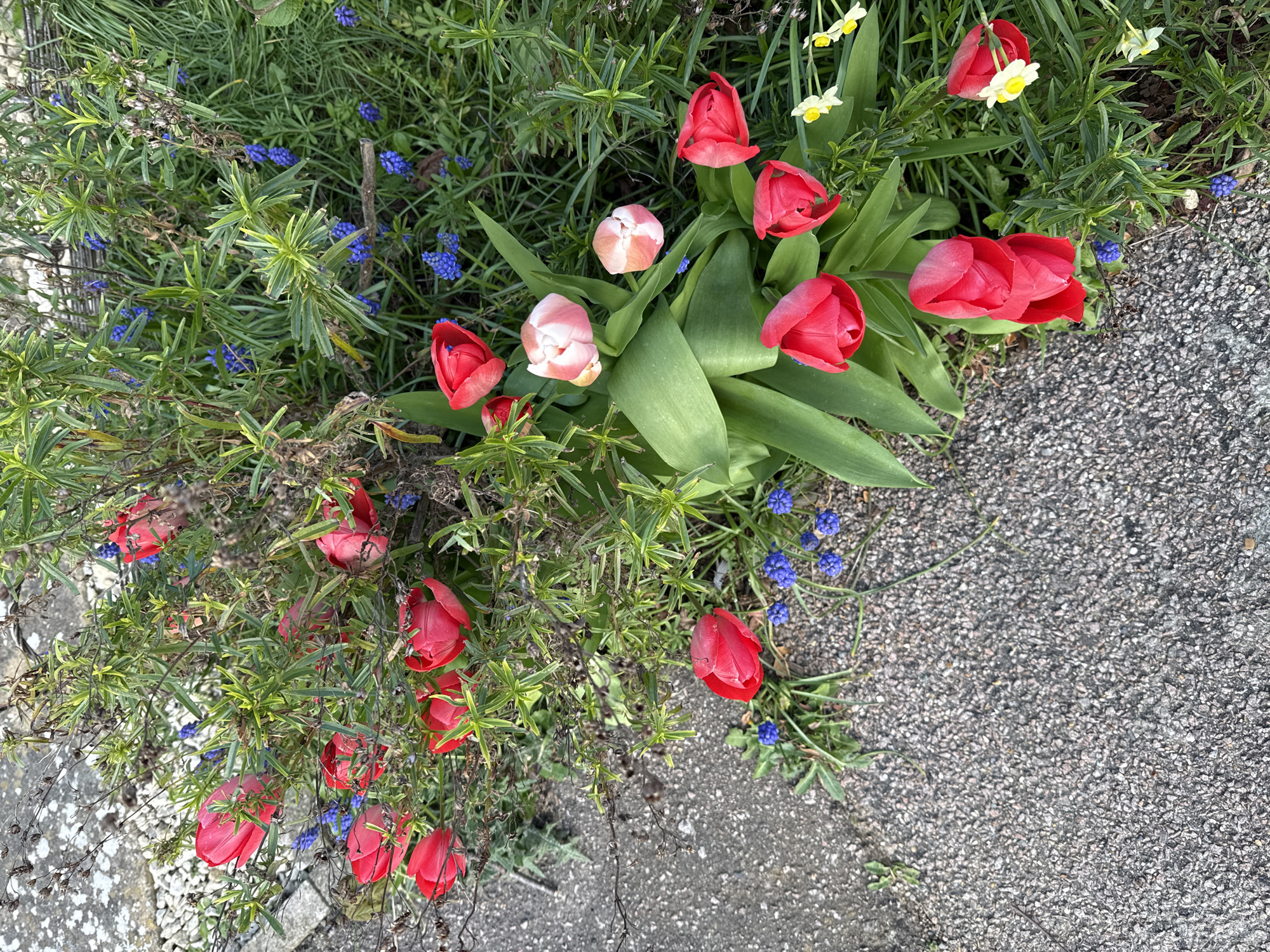 A high-angle, medium shot captures a ground-level flowerbed adjacent to an asphalt surface. Predominantly, the flowerbed hosts a mix of vibrant red and pink tulips in various stages of bloom, nestled amidst green foliage. Small clusters of blue Muscari flowers punctuate the greenery. Near the upper edge of the frame, several miniature white and yellow daffodils are interspersed with the other flowers. The asphalt surface, comprising the lower right quadrant of the image, is textured with small, closely packed stones. There are no people visible in the scene. The location is assumed to be somewhere in Great Yarmouth, United Kingdom.