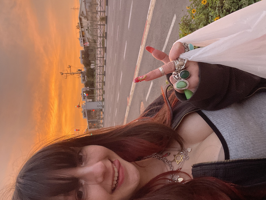 A young woman takes a selfie against a vibrant sunset background. She's on a street with buildings and a traffic signal in the distance. She makes a peace sign with rings on her fingers and holds a white plastic bag. She wears a gray top and a brown jacket. A chain necklace with a star of David and other charms adorns her neck. Her dark hair features red highlights, and she smiles toward the camera.