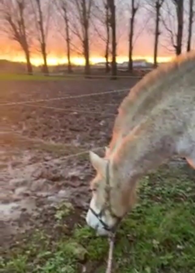 The scene shows a horse grazing in a muddy field at sunset. The horse, with a light-colored coat and dark mane, is wearing a halter and lead rope. The ground is covered in puddles and mud. Behind the horse, a vivid sunset paints the sky with orange hues. Bare trees silhouette against the horizon, adding a stark contrast to the warm colors of the setting sun. A wire fence stretches across the field.