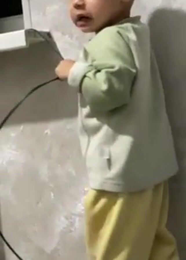 Two young boys are indoors near a wall. The younger boy is wearing a light green long-sleeved shirt and light yellow pants. He is holding a black electrical cord in his right hand and trying to put the end of it into a socket on a wall unit. There is a potted plant on top of the unit. The other boy is slightly older, wearing light blue pajamas with a food-themed print. The wall is gray and looks to be slightly textured. There's a white radiator on the wall.
