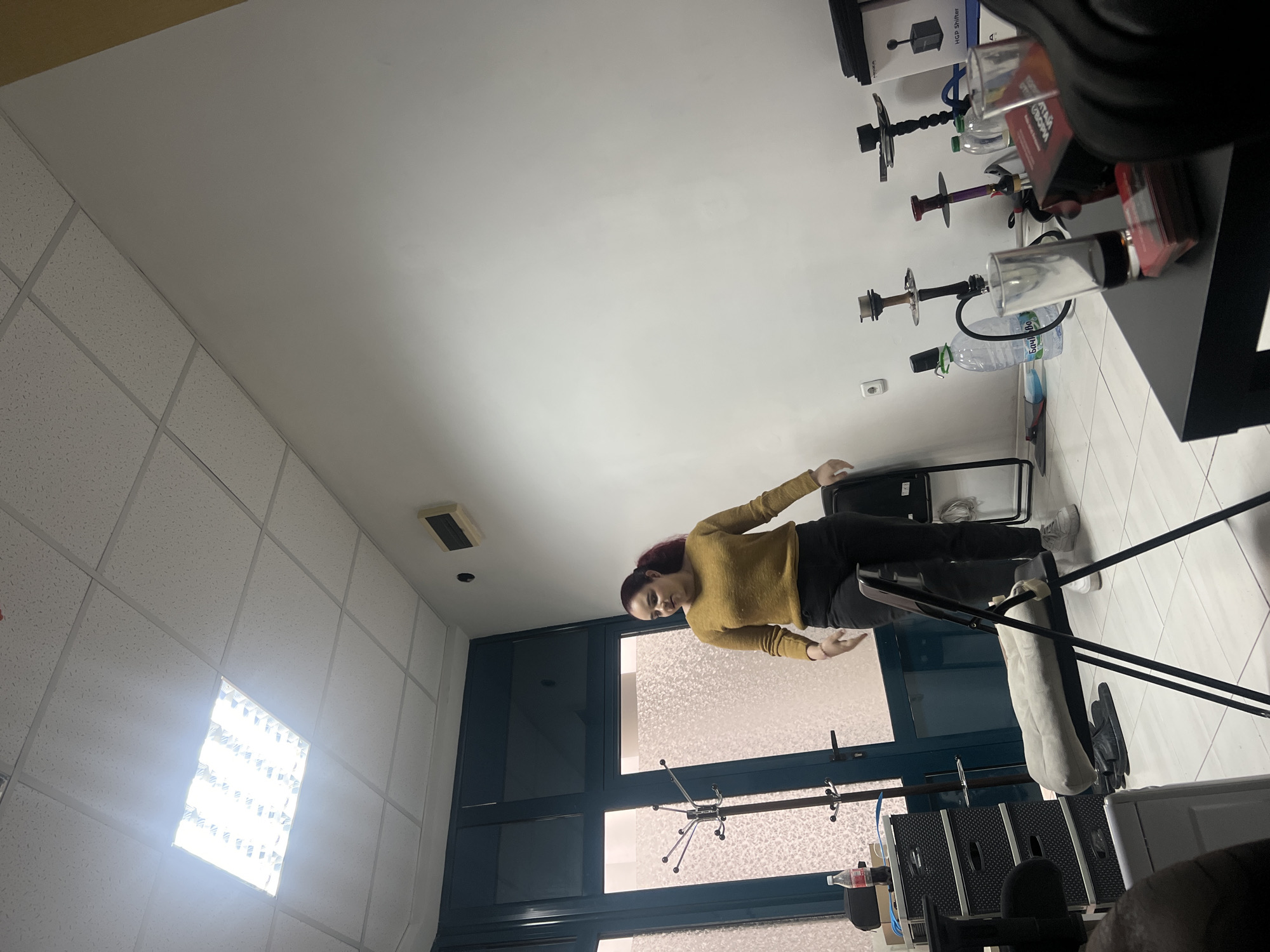 A woman with auburn hair, wearing a mustard-colored sweater and dark pants, stands in an office. The office has a drop ceiling with fluorescent lighting. A large window with a coat rack in front of it is visible. A display shelf of hookahs is on the right wall. The precise location in Sofia, Bulgaria cannot be determined from the image.
