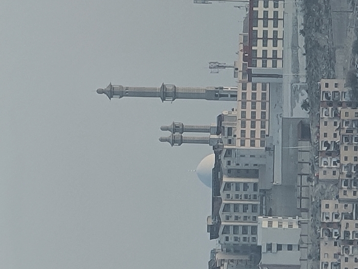 The image displays an urban landscape in Qudsaiya, Syria, under a light grey, overcast, or hazy sky. In the mid-ground, a prominent mosque features a large, white hemispherical dome and three grey minarets. One minaret is significantly taller and more ornate with multiple tiered balconies, positioned to the right of the dome. Two shorter, identical minarets with single balconies are situated further left, behind the main dome structure. Surrounding the mosque are various multi-story buildings, predominantly appearing residential or mixed-use, constructed from light-colored concrete or stucco in shades of white, beige, and light grey. These buildings exhibit numerous rectangular windows. Communication antennas or cellular towers are visible on rooftops in the mid-ground. The lower portion of the image depicts a densely built residential area situated on a sloping terrain. These buildings are typically 2-5 stories high, of uniform design, and constructed from light-colored materials. The underlying terrain appears dry and light-colored, suggesting arid conditions. No individuals, vehicles, or dynamic actions are discernible in the static scene.