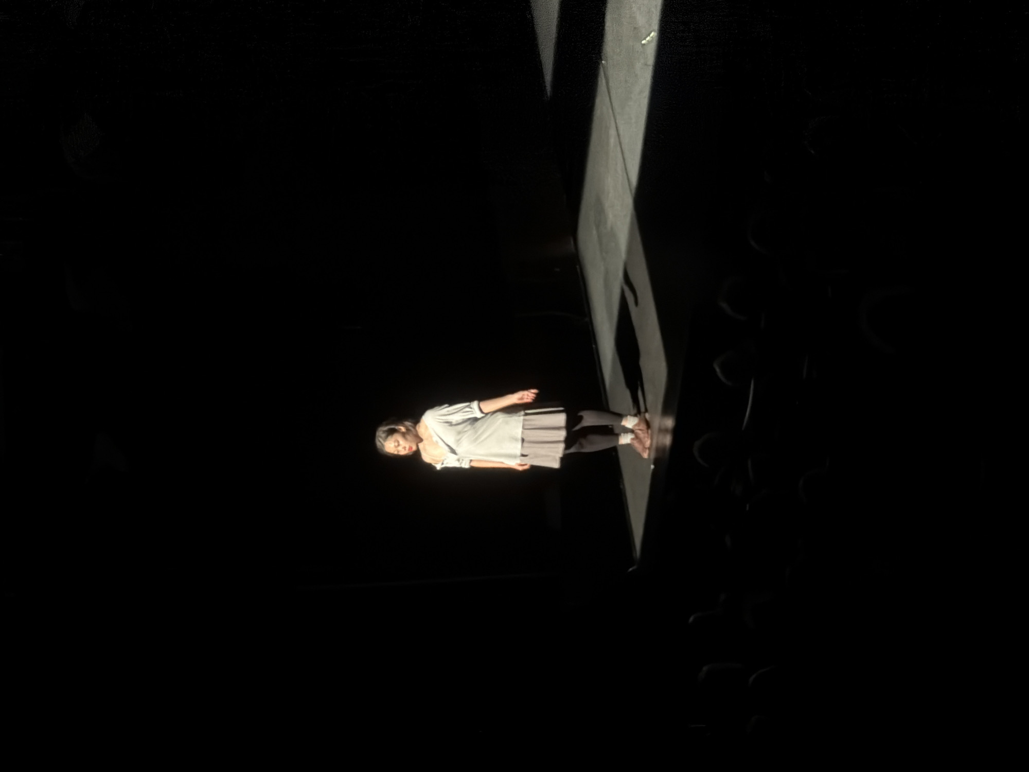 A woman is on a stage in Villejuif, France. She is wearing a white short-sleeved shirt, a gray dress, and black leggings. She is barefoot. A beam of light illuminates her and part of the stage. The audience is visible in the darkness on the right.
