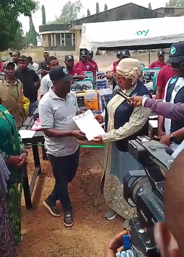. The video shows a scene of a person in a patterned light blue dress and a head covering, handing over a document to a man in a gray shirt, jeans, and a baseball cap. They are surrounded by a group of people. There are tables with what appears to be equipment or products on them. There are cameras focused on the interaction between the two individuals. The setting seems to be outdoors, with a building in the background.