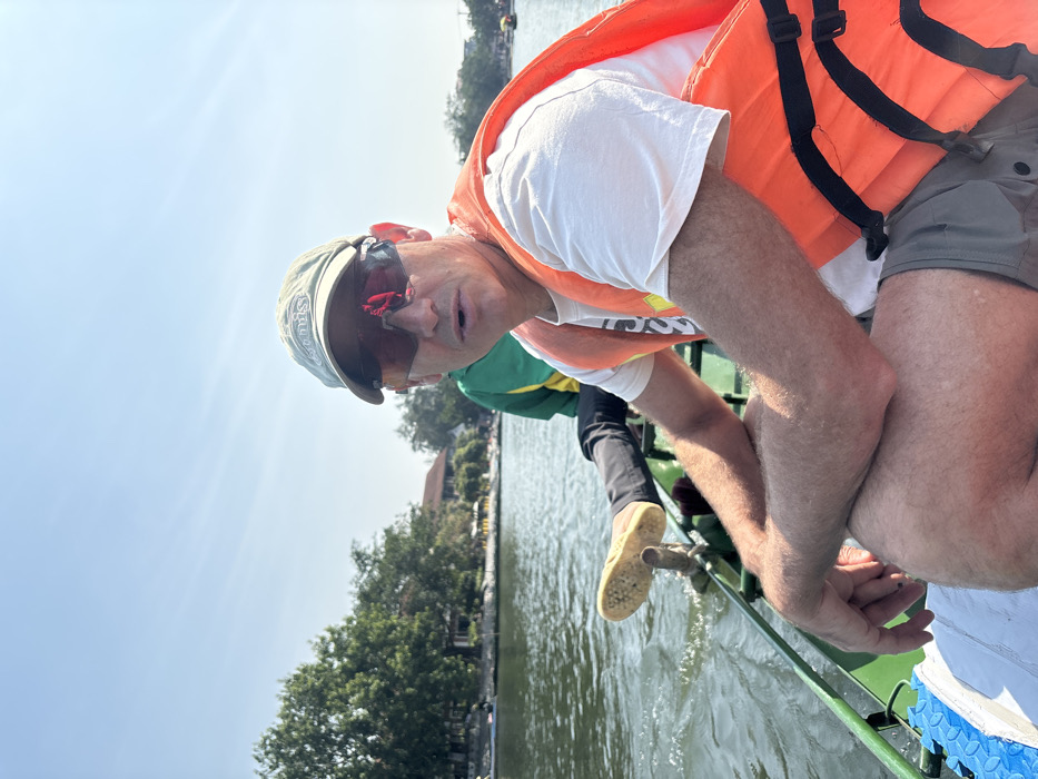 - "A man in a white t-shirt, orange life vest, and sunglasses sits on the edge of a green boat on a sunny day" by FM-bmo3E3, licensed under CC BY 4.0