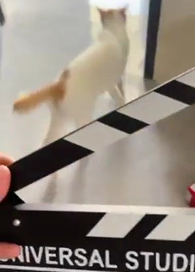 A hand holds a Universal Studios clapboard in front of a cat standing on a gray tiled floor. The cat is mostly white with orange markings and looks toward the camera. The clapboard is then clapped, and the cat walks away.