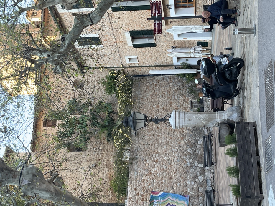The image depicts a daytime scene in a public square or plaza in Fornalutx, Spain