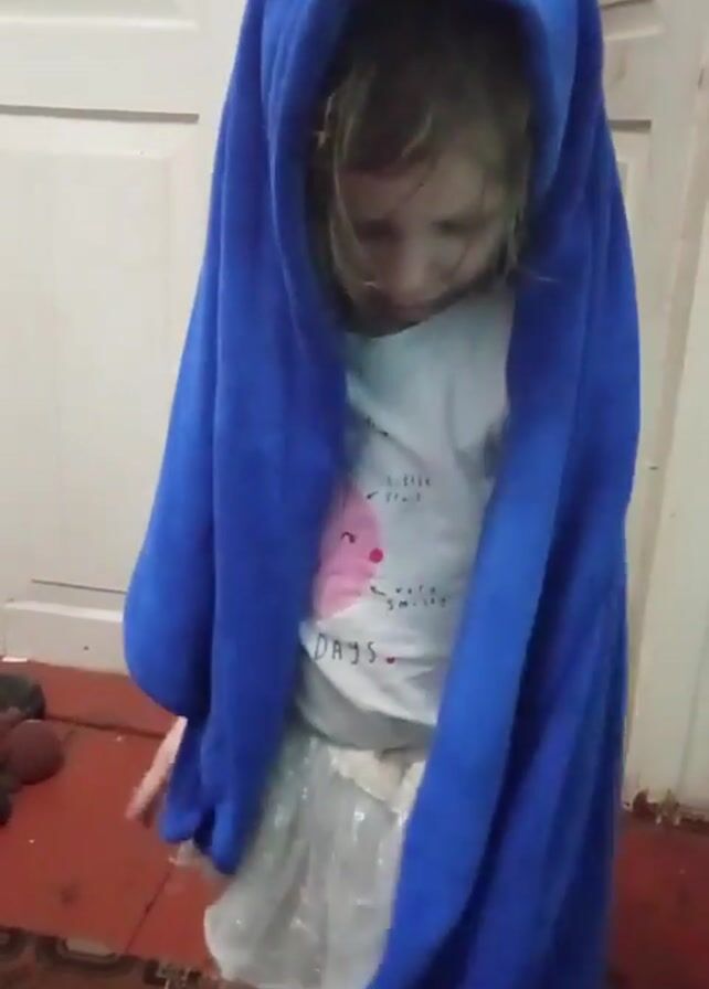 A young child is standing inside a room wearing a white t-shirt with a pink design, a white tutu, and a blue towel draped over her head