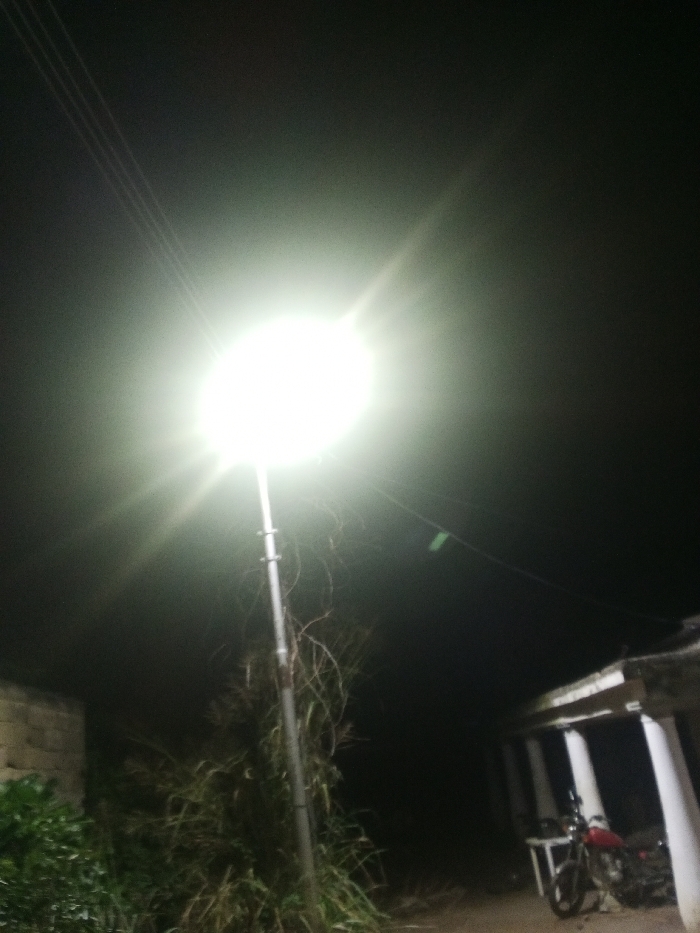 A brightly illuminated streetlight dominates a dark scene. The light source is so intense it creates a strong lens flare. Underneath the lamp is a metal pole obscured by grass. A small brick structure and a partially visible building with white columns are at the right of the frame. A motorcycle is parked under the building’s overhang. Three power lines cross through the upper-left corner. The setting seems to be a rural area due to the overgrown vegetation.