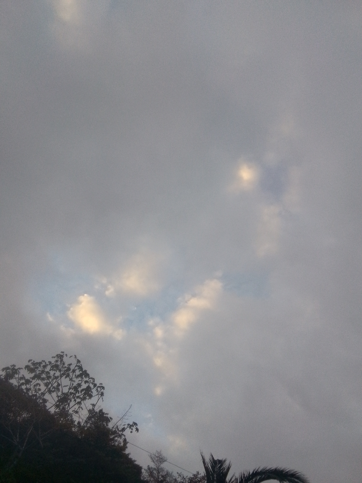 The image depicts a cloudy sky over the city of Unknown, Unknown. Trees, including a palm, are visible in the lower portion of the frame. The sky is predominantly gray with breaks revealing some blue and illuminated clouds.