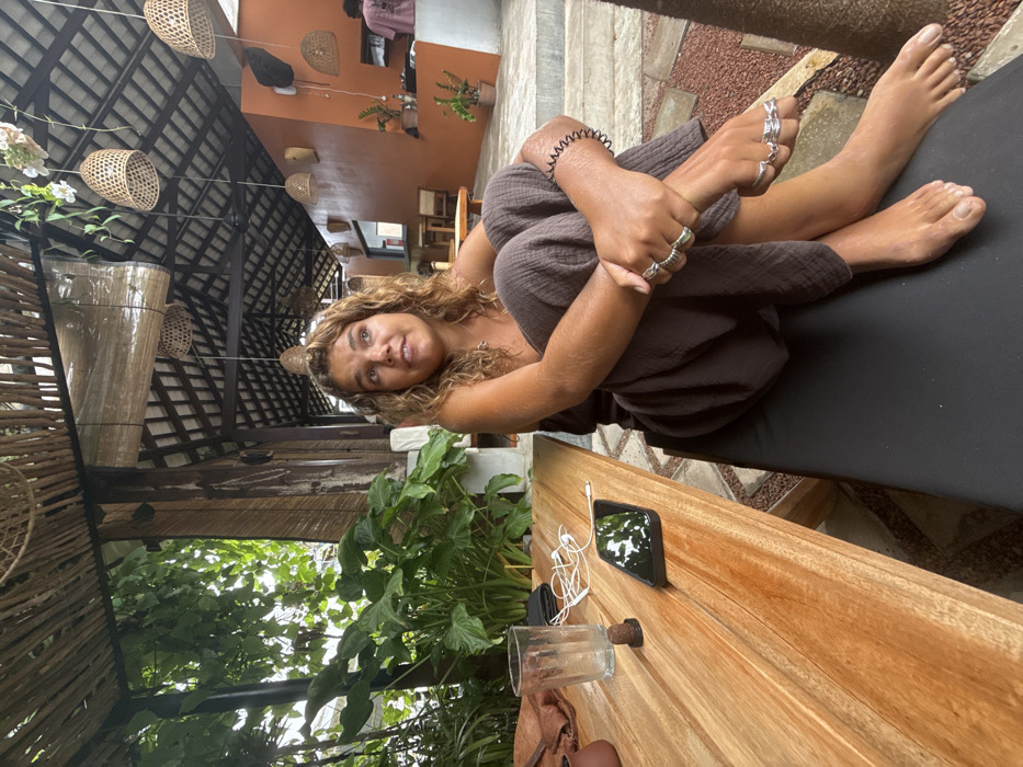 A woman with curly hair sits on a lounge chair with her legs folded. She wears a brown outfit and several rings. On a wooden table nearby, there's a smartphone, earphones, a glass, and a brown cloth. Lush greenery is visible behind the table. The background includes parts of a building with an open roof structure decorated with woven baskets, and stone pathways.