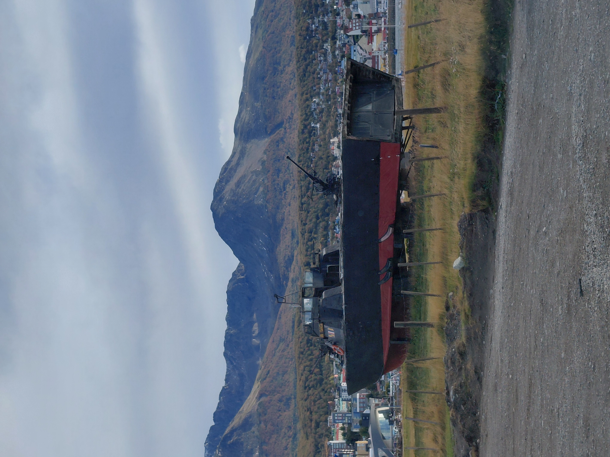 - "section of the town of Ushuaia, Argentina, with a dark-colored, partly rusted, decommissioned ship prominently displayed on land along the road and a hill" by FM-HAKh33, licensed under CC BY 4.0