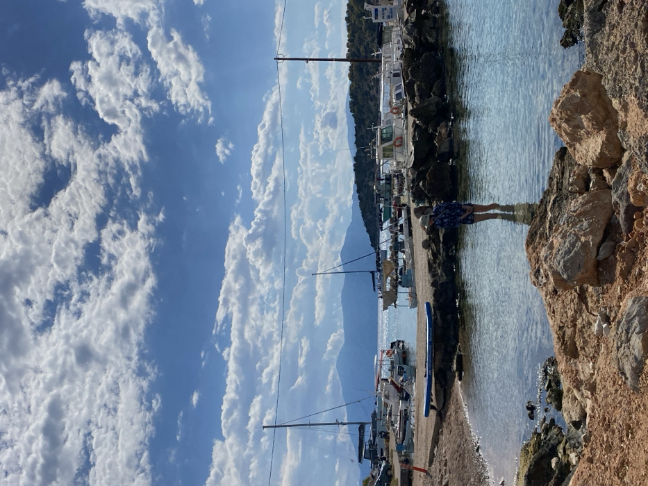 This image displays a coastal scene within a small harbor area in Megalochori, Greece, under a partly cloudy blue sky. In the mid-foreground, one individual stands in shallow, clear water, facing away from the camera. This person wears a dark, patterned short-sleeved top, shorts, and a light-colored hat, with their lower legs submerged to approximately mid-calf level. The immediate foreground consists of a rocky and sandy shoreline with reddish-brown rocks. To the left of the standing individual, a blue inflatable stand-up paddleboard (SUP) lies flat on the sandy beach. A low, rocky breakwater extends into the water to the right, behind which numerous boats are docked or moored. These vessels include several small fishing boats, at least two sailboats with visible masts, and larger white cabin cruisers. Some boats are directly against a concrete or paved section of the shore. Overhead wires are visible traversing horizontally across the mid-upper portion of the image, supported by a dark utility pole on the far right. In the background, a large body of water reflects sunlight, extending towards distant, hazy blue-grey mountains. The sky is populated with numerous white cumulus clouds. Green foliage is discernible on hillsides bordering the water in the mid-distance.
