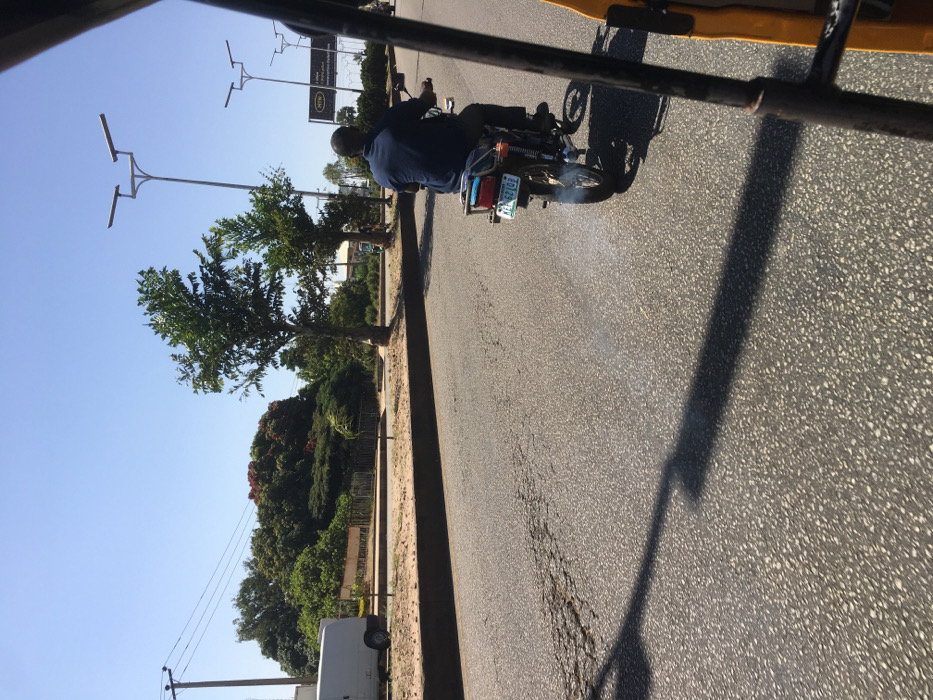 The scene depicts a sunny daytime street in Jos, Plateau State, Nigeria. The perspective is from inside a moving vehicle, evidenced by a yellow structural frame partially visible on the far right and a prominent, long shadow cast diagonally across the asphalt road. In the foreground, the asphalt road exhibits cracks and wear. In the midground, a man, viewed from behind, wears a dark blue shirt and dark trousers while riding a black motorcycle. White exhaust fumes are visible emanating from the motorcycle's tailpipe. The motorcycle's license plate reads "PL 6710 JP". A concrete median separates the road from a paved shoulder featuring young trees. In the background, a white panel van is positioned on the left side of the road, beyond the median. A dense cluster of trees, some with green and others with reddish-brown foliage, forms a natural backdrop. On the right, multiple tall streetlights with modern, dual-arm LED fixtures line the road. Two large billboards, one displaying the "MTN" logo, are visible in the distance. The sky is clear and bright blue.