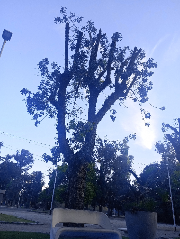 A tall tree dominates the frame, its heavy, dark trunk splitting into thick branches. The branches are partially trimmed, revealing stubby ends alongside sparse leaves. A blue sky peeks through the foliage. A street lamp stands on the left. In the foreground, the back of a park bench and a concrete planter create a sense of depth. Other trees recede into the background, forming a park-like setting.