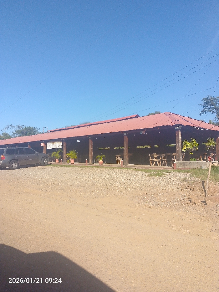 An outdoor scene in La Arepa, Venezuela, depicts a long, open-sided pavilion with a red corrugated metal roof, supported by dark wooden pillars. The structure contains multiple wooden picnic-style tables and benches, visible through its open facade, and is adorned with potted green plants. A dark grey SUV is parked on the gravel and dirt forecourt to the left of the pavilion. The forecourt, composed of light brown gravel and dirt, extends into the foreground. A raised concrete platform borders the pavilion. The background features green trees and foliage under a clear, bright blue sky. No individuals are visible. Power lines traverse the upper right portion of the image. A digital timestamp "2026/01/21 09:24" is embedded in the lower left corner.
