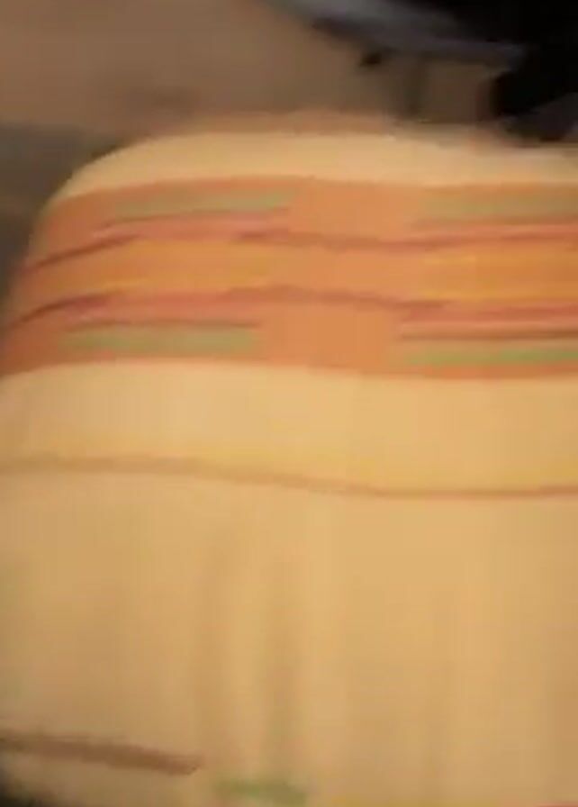 white cat with a black face and tail being petted by a person. The cat stands on a dresser with a black backpack sitting on a chair behind it. The cat then jumps from the dresser to the top of the backpack.