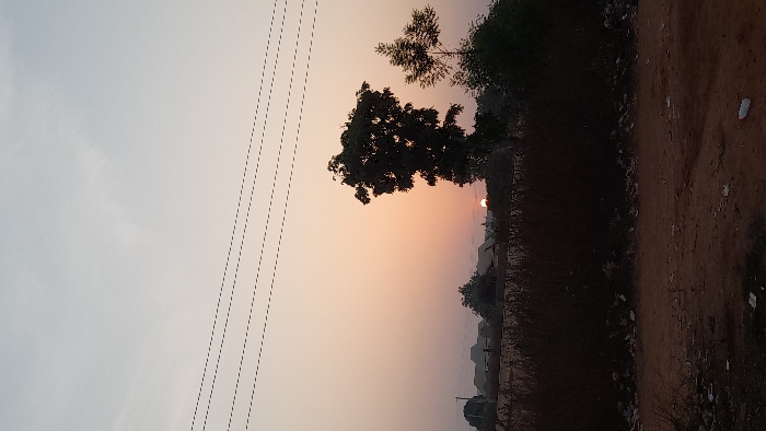 landscape at sunset. Power lines are visible on the left. A silhouette of a tree is centered with the sun behind it. Buildings and foliage form a horizontal line in the midground. The right side of the image shows a dirt surface. The sky has a gradient of colors ranging from light grey to orange.
