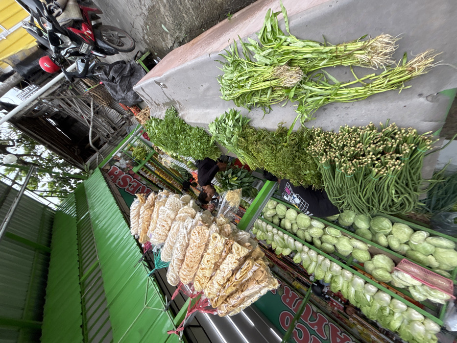A vibrant Asian market stall displays an assortment of fresh produce. Bunches of water spinach lie on top, followed by various greens. The stall shelves hold chayote squash, and cabbages. Hanging strands of crackers, along with the green metal stall awning contribute to the lively scene. A parked motorbike adds to the bustling atmosphere.
