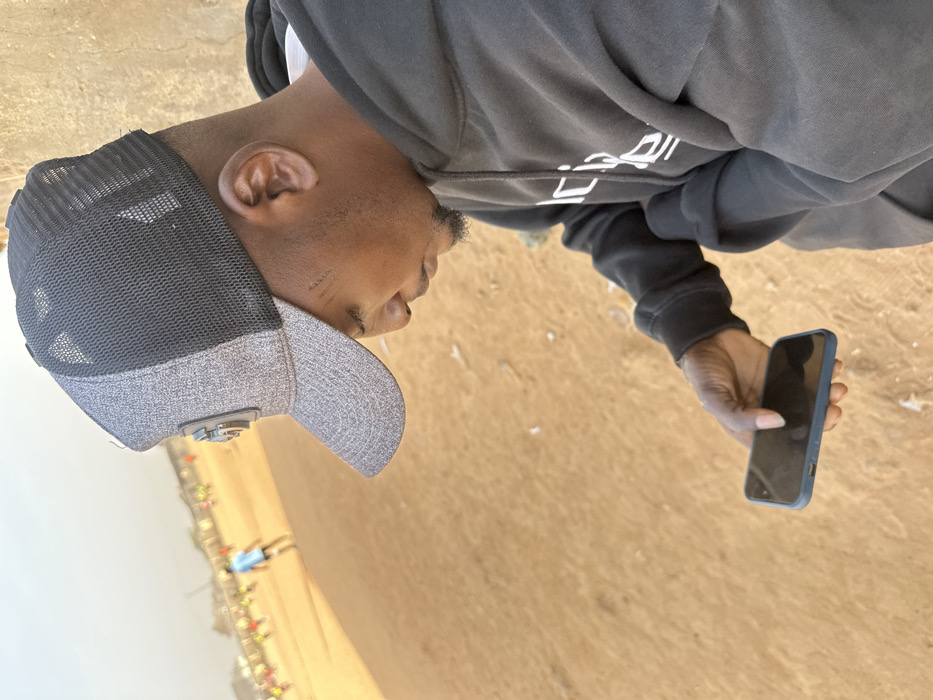 An individual wearing a grey and black baseball cap, a dark hoodie with white lettering, and a white undershirt is holding a blue cell phone. The person has dark skin and a short beard. In the background, there is a sandy or desert-like terrain with rows of small colorful flags or markers visible in the distance. The picture seems to be taken from a higher angle, looking down at the subject. The image is rotated so the horizon is vertical.