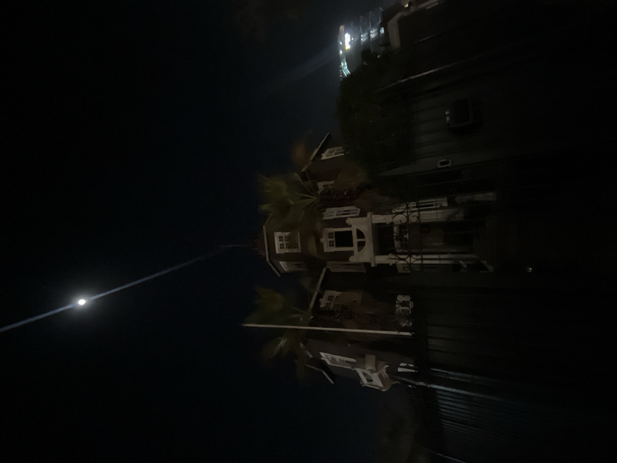 At night in Unknown, Unknown, a dimly lit residential street features a multi-story house with a white facade and multiple windows, partially obscured by palm trees. Adjacent to the house, a taller building looms, with visible windows and an indistinct structure on top. A streak of light, originating from the top left corner, stretches across the dark sky. The overall atmosphere is dark and indistinct, with few details clearly discernible.