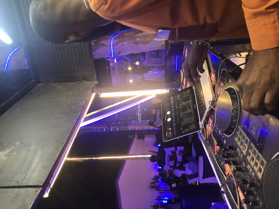 At a nighttime event, a DJ in an orange shirt mixes music. The equipment includes a laptop with DJ software, a mixer, and turntables. An audience is visible in the background, with blue uplighting creating a party atmosphere. The venue features modern decor with linear lighting fixtures.